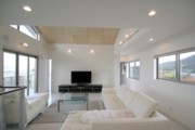 玄関からごく自然と動線に招き入れられ、ワクワク感のあるストリップ階段を上がるとそこには、西側に玄海灘の大海原、島々、そして岬、港町を180°望むことが出来き、又、東側には四季を感じられる山々を一望できます。 そんな32.5畳の開放的な大空間の『リビングゾーン』が広がります。この空間に身を置いた瞬間、光・風・視界が通り抜ける気持ちよさを体感する事ができます。リビングにはスクリーンで観る迫力のホームシアター、ここは家族がくつろげる団らんの中心です。